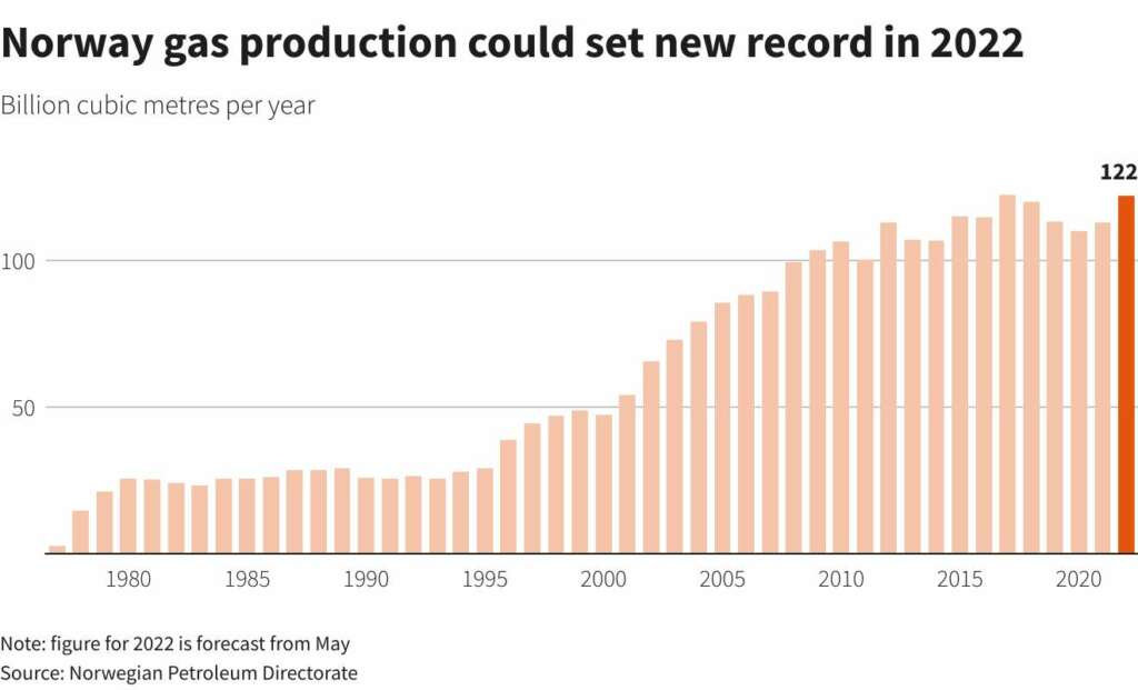 Graphic: Norway gas production could set new record in 2022 Norway gas production could set new record in 2022 https://graphics.reuters.com/NORWAY-GAS/xmpjomwxevr/chart.png