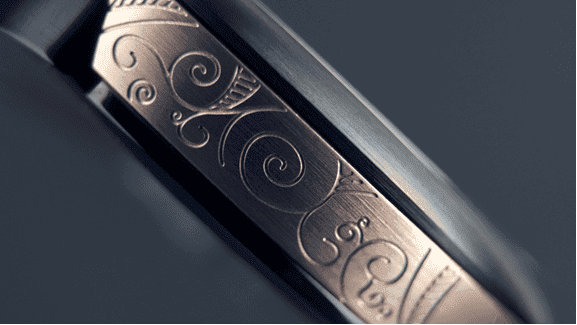 The complex three-piece construction case is enhanced further by the two-tone colouring – a central rose gold section is the perfect way to best display the intricate engraving. As a final flourish, the side studs, discreetly engraved with small skulls, are also rose gold.